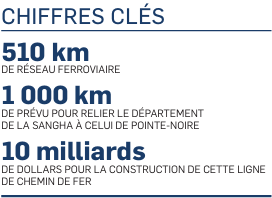 Le Congo envisage la construction d’une ligne de chemin de fer devant desservir le nord et le sud en vue de faciliter l’exportation des produits miniers et d’hydrocarbures. Longue de 1000 km, cette voie ferrée reliant le département de la Sangha à celui de Pointe-Noire, le port minéralier en devenir, devrait nécessiter un investissement de 10 milliards de dollars.