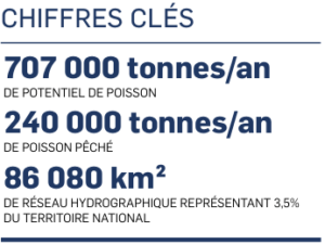 La production annuelle actuelle, essentiellement artisanale et continentale, est d’environ 240 000 tonnes soit environ 30% du potentiel. En raison de la longueur réduite de la côte, les captures d’origine marine sont modestes et estimées à environ 2% de la production totale depuis les années 1980, avec seulement 6 000 tonnes.