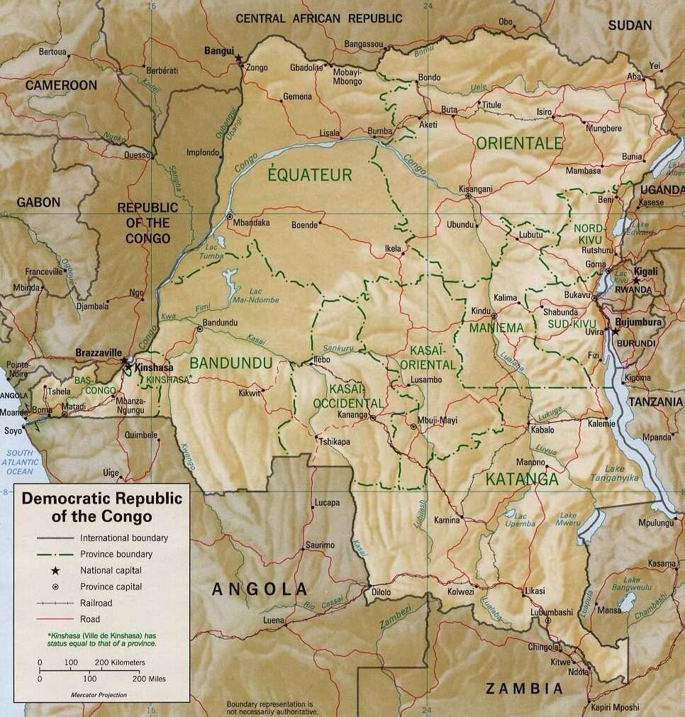 La République Démocratique du Congo (RDC), située à cheval sur l’Équateur, partage près de 9 000 km de frontières avec neuf pays (Soudan du Sud et République Centrafricaine au Nord, Ouganda, Rwanda, Burundi, Tanzanie à l’Est, Zambie et Angola au Sud, République du Congo et la province angolaise de Cabinda à l’Ouest).